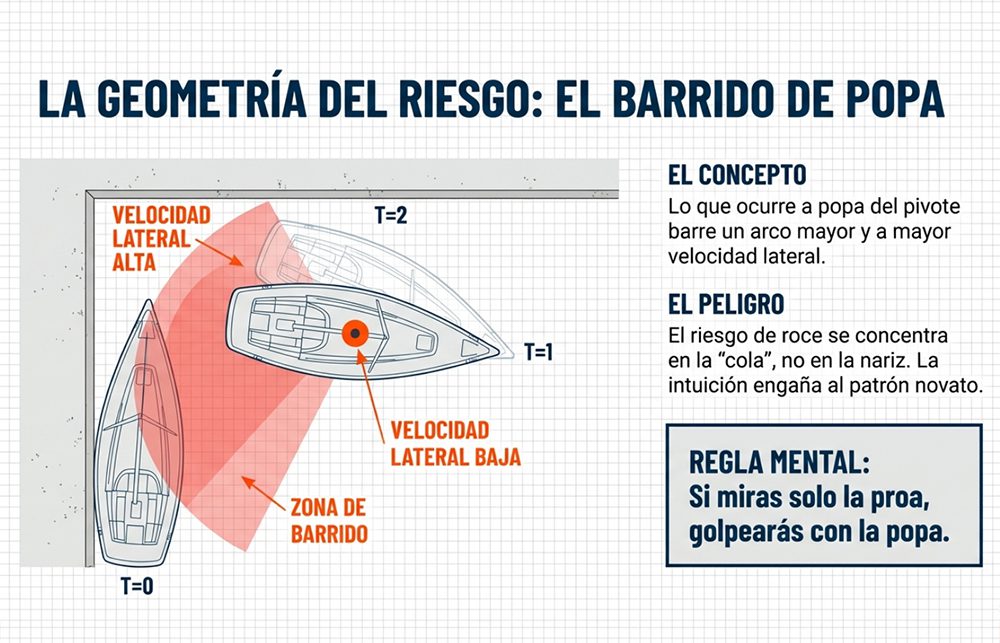 En marina, el riesgo no suele estar en la potencia, sino en la falta de anticipación. El Punto de Pivote permite pensar la maniobra como geometría en movimiento: si sabes dónde está tu eje, sabes qué parte barrerá más y dónde debes dejar margen.