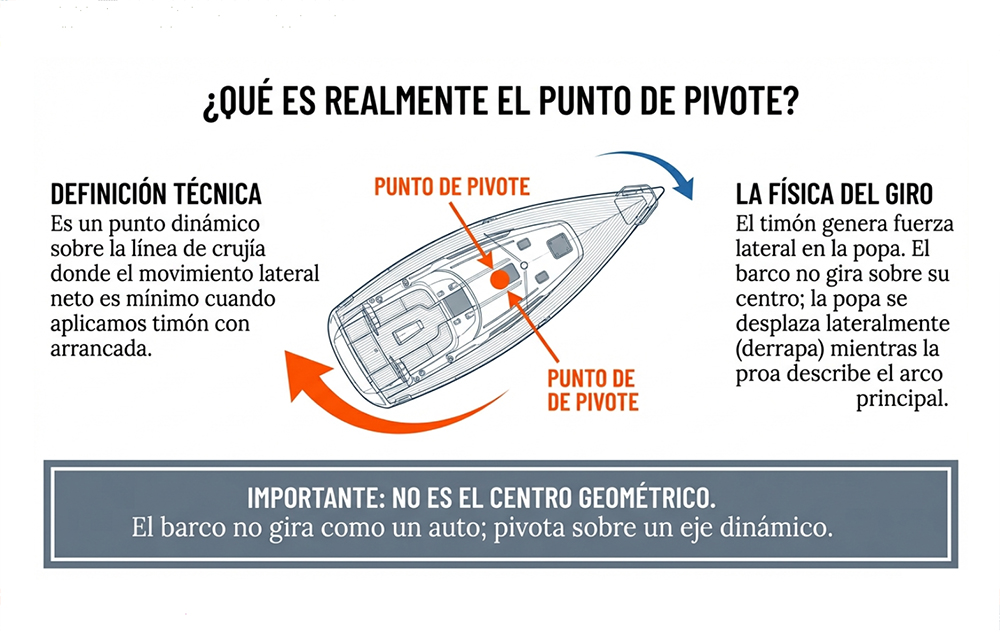 Cuando el velero avanza con arrancada y aplicamos timón, el barco no gira sobre su centro geométrico. En cambio, existe un punto dinámico sobre la línea de crujía donde el movimiento lateral neto es mínimo: ese punto es el Punto de Pivote.