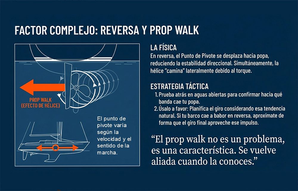 En veleros con eje fijo, al dar marcha atrás la hélice genera un empuje lateral que “camina” la popa hacia una banda. Esta tendencia modifica la trayectoria del barco justo cuando el espacio de maniobra es menor. En reversa, además, el Punto de Pivote se desplaza hacia popa, aumentando el barrido lateral y el riesgo de contacto si no se anticipa.